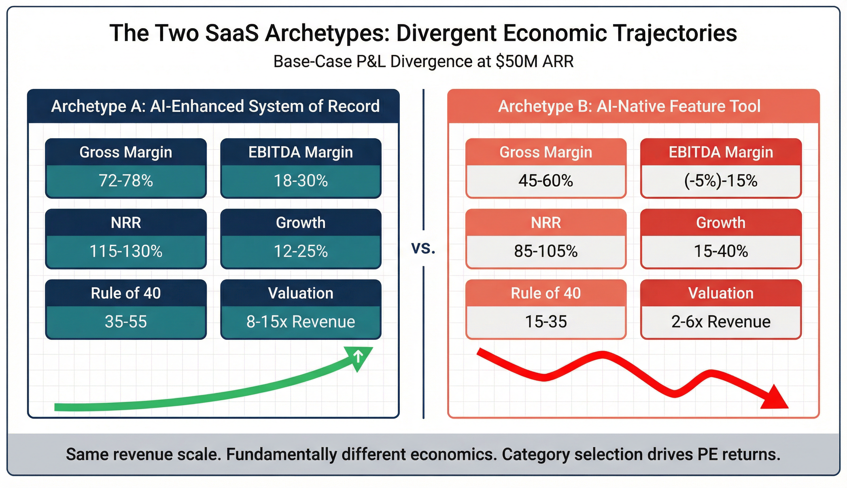 The implied enterprise value difference between these archetypes — potentially 2–3x at the same revenue scale — illustrates why the blanket "AI kills SaaS" narrative is as wrong as the blanket "SaaS is safe" narrative.