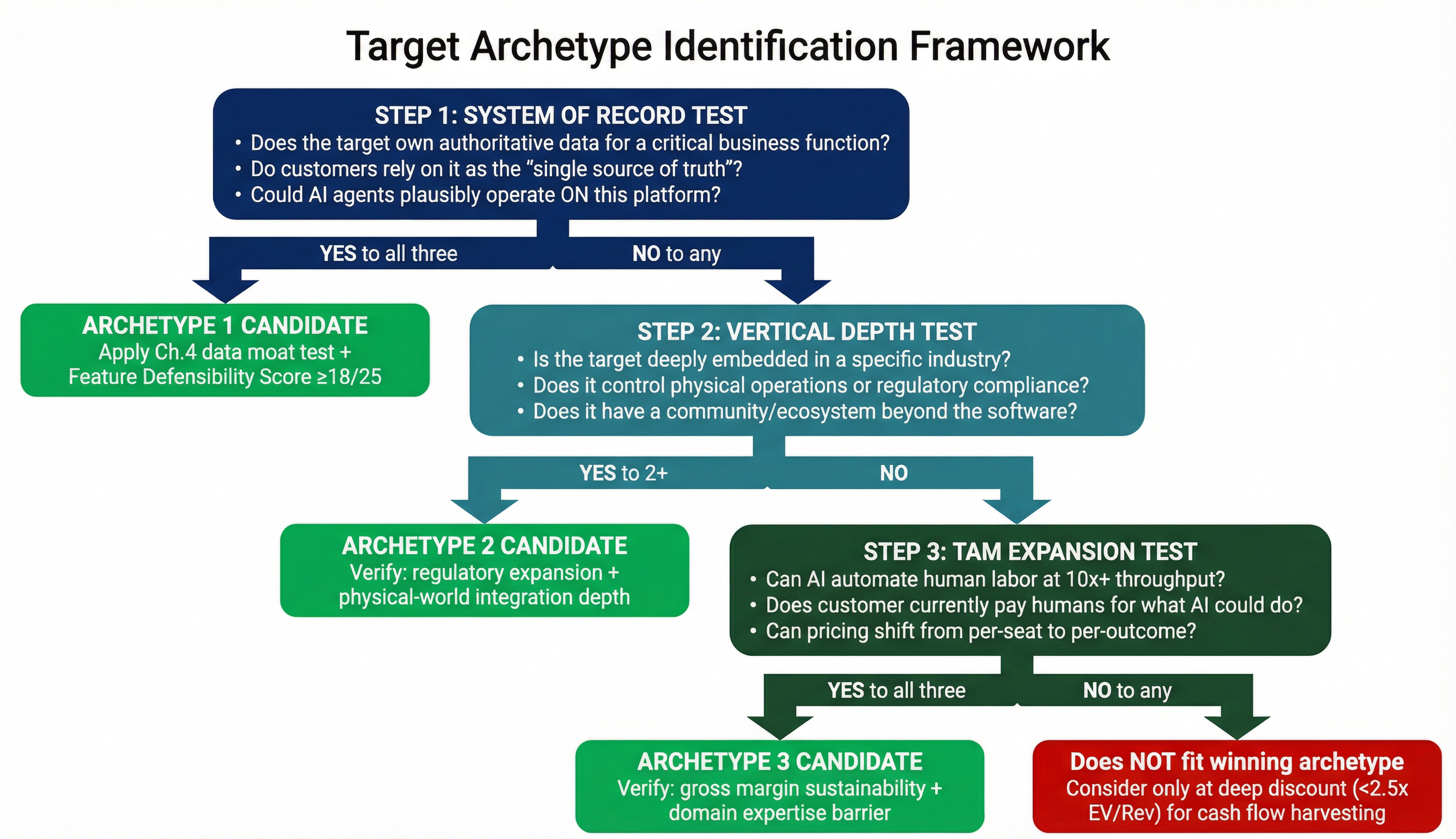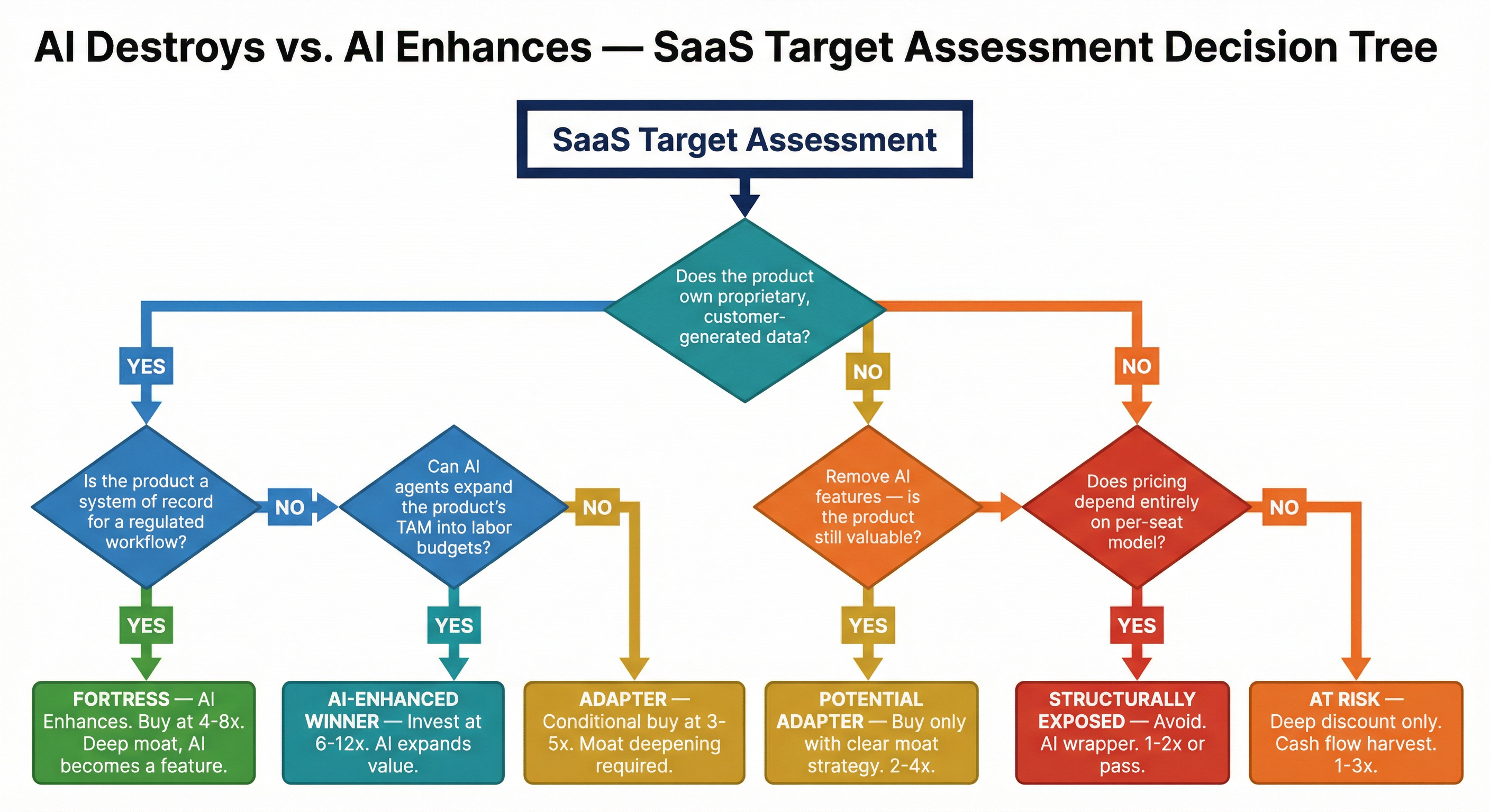 - AI Moat Assessment using the decision tree — classifying targets as Fortress, AI-Enhanced Winner, Adapter, or Exposed