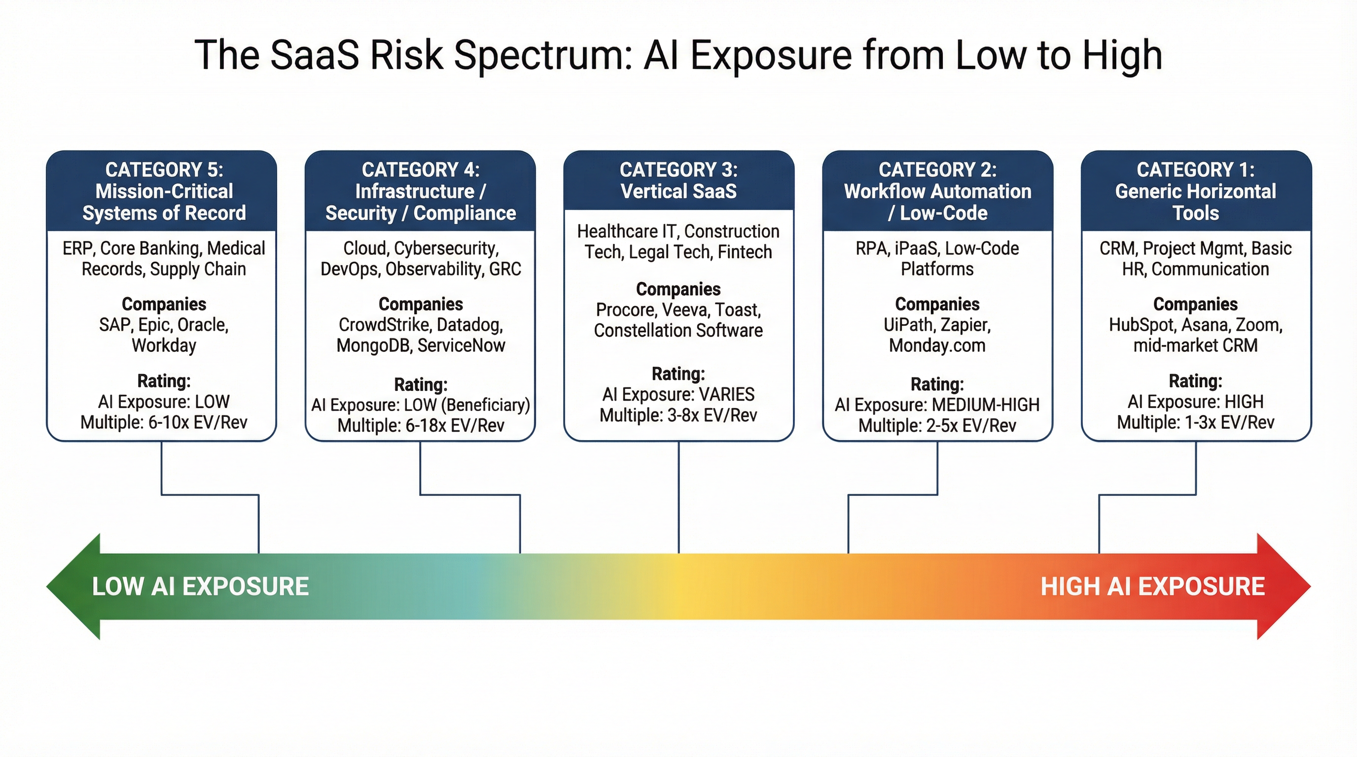 That's a 5–6x spread between the most and least valued categories — and it's widening. The market is differentiating with increasing precision between software that AI makes more valuable and software that AI makes obsolete.