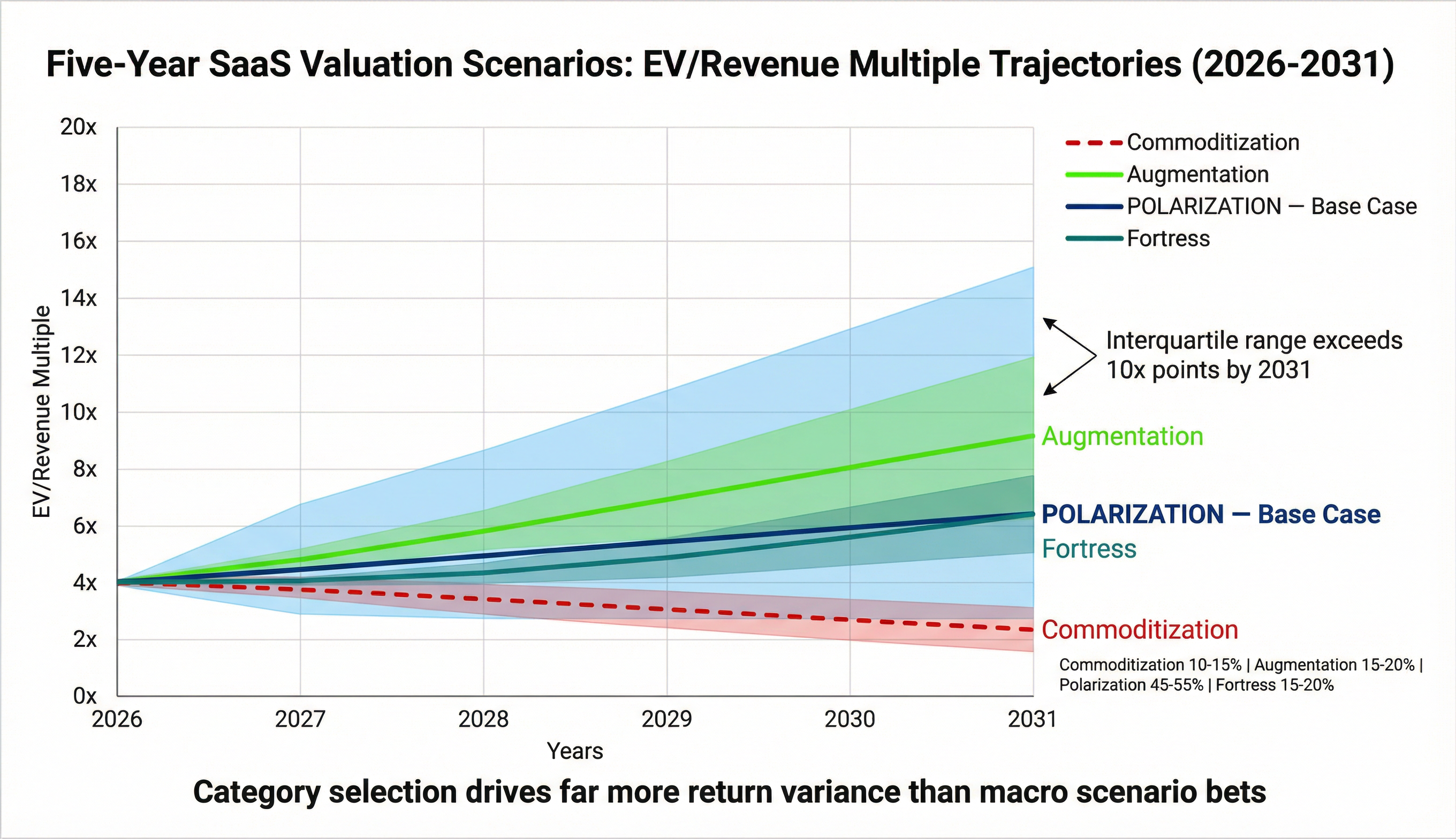 The defining feature: under the base case, the gap between top-quartile and bottom-quartile SaaS multiples widens to 10–16x by 2031 — the largest dispersion in the history of the SaaS sector.