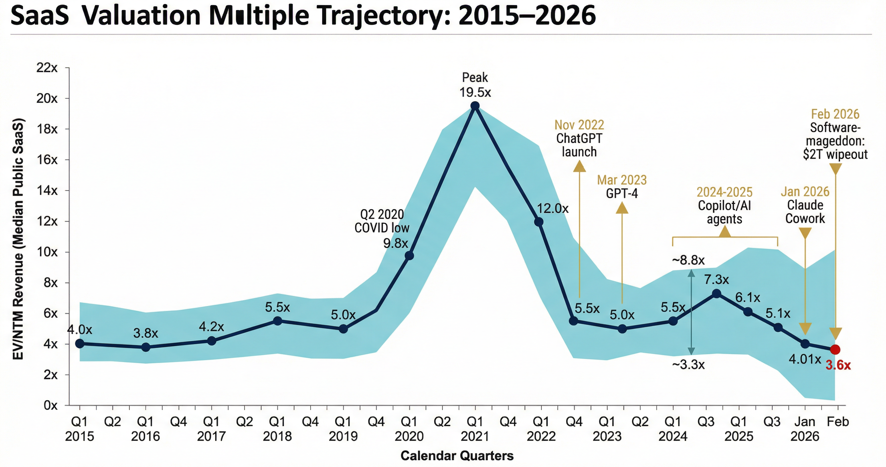 Cyclical multiple normalization — the inevitable unwind from 2021's zero-rate-fueled 15x+ revenue multiples. This was happening regardless of AI.